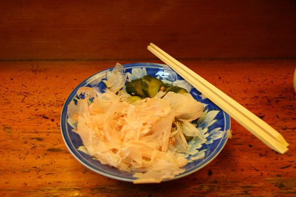 While Chef Kawano was getting the Unagi into our rice bowl his wife served a side dish, which was basically one whole pickled Japanese cucumber under a *mountain* of Katsuo-bushi (skipjack tuna shavings), seasoned with a Dashi soy sauce. The picture shows the serving for one person. I don't know if this is a typical side dish for Kansai Style Unagi, but I've never had this much Katsuo-bushi shavings served to me in any side dish or even main course. An interesting way to start a meal for sure, but as it turned out the Katsuo-bushi worked great as a appetizer, bringing an Umami taste to the mouth while not taking up much room.